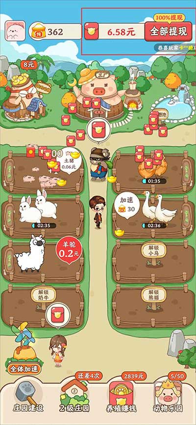 幸福庄园赚钱游戏是一款模拟养殖动物的游戏,这款游戏风格轻松简单,画面卡通可爱,能让你每天花几分钟就可以体验养殖赚钱的乐趣。而在游戏中玩家需要通过养殖动物,出售动物,升级庄园建设等来逐步将庄园发展壮大。同时在玩家出售动物后还可以获得红包奖励,当玩家的红包收集到一定额度后就可以将它提现至微信中。