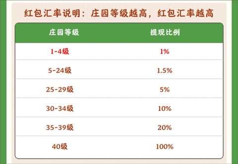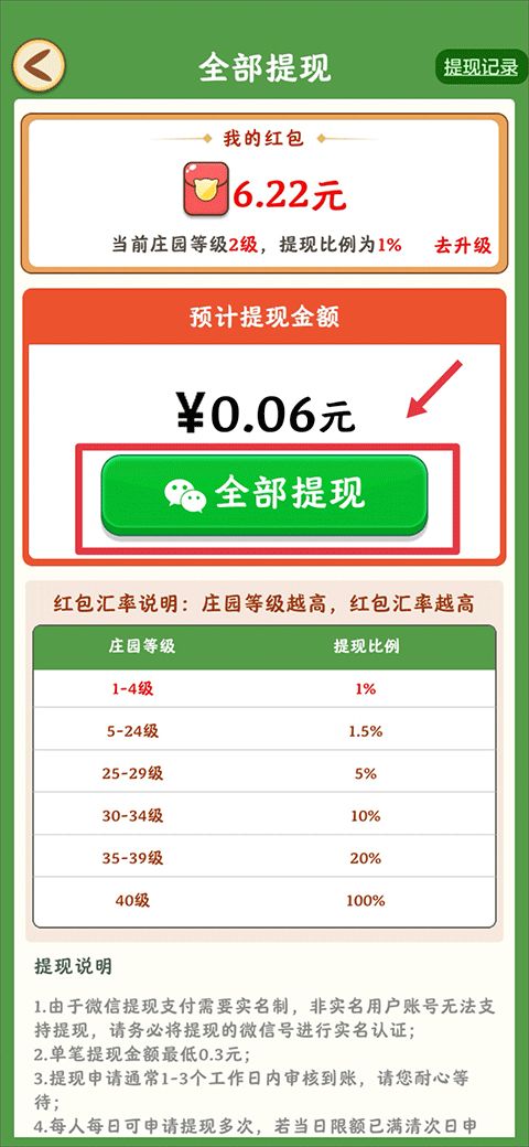 4、若玩家觉得提现比例较小时,可以通过升级庄园的等级来提现,庄园等级越高红包汇率越高