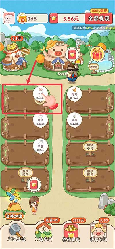 1、新人首次登陆幸福庄园,跟着系统的指引进行养殖,待一定时间过后对动物进行红包收取