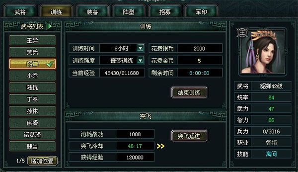 要想提升武将等级,必须要坚持不懈的进行训练。选中校场,点击“训练”按钮进入训练界面。从左侧的武将列表中选择参加训练的武将,再选择训练模式即可安排武将进行训练。
