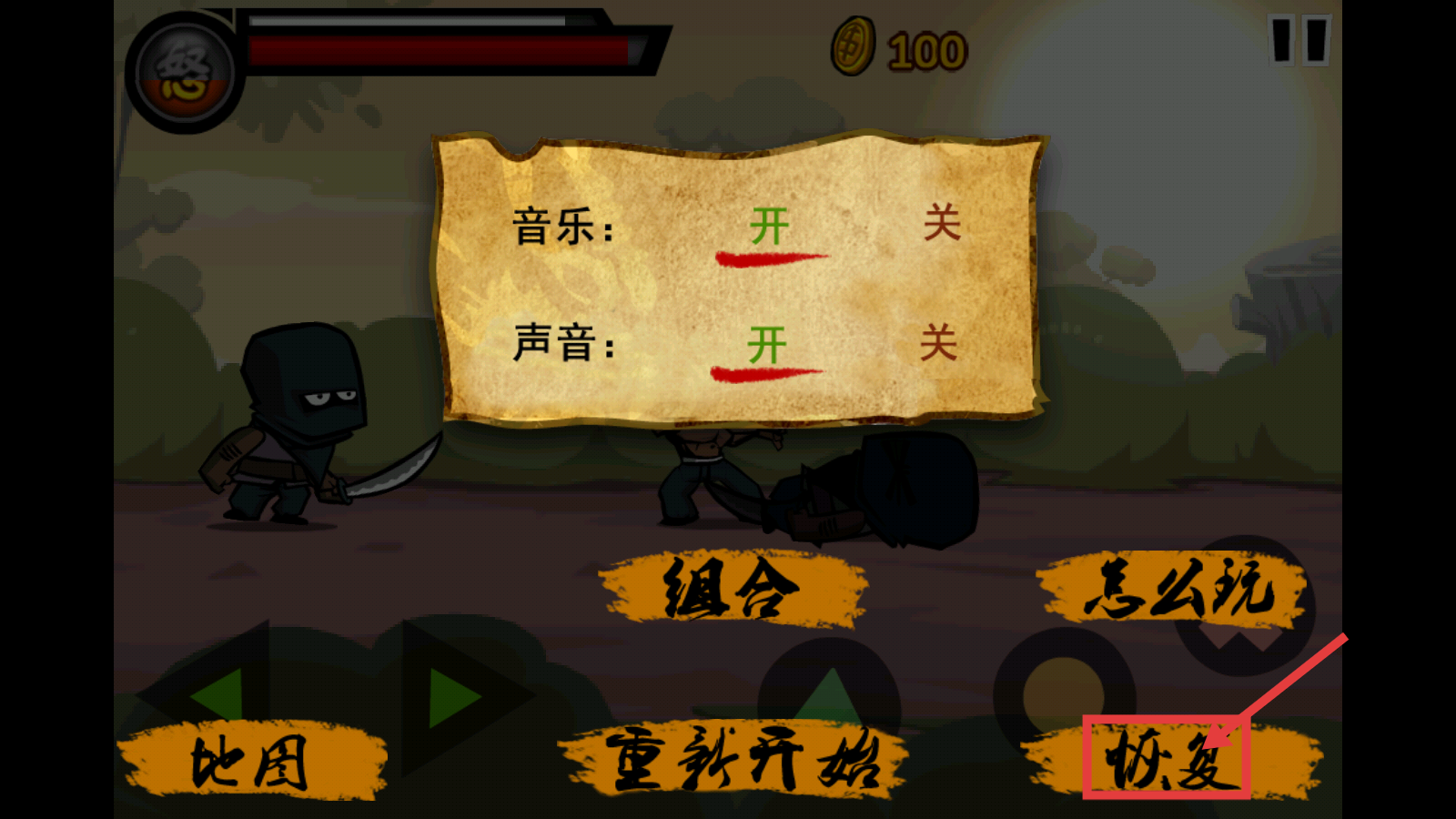 4、在菜单界面,可设置【音乐-开】【声音-开】,点击【恢复】继续战斗,合理利用功能选项。