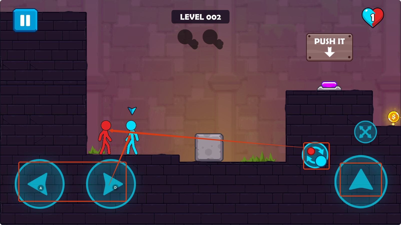 2、在LEVEL-002中,利用【方向键-A/D】和【切换角色按钮】,操控红蓝小人协作,推动石块等机关推进关卡。