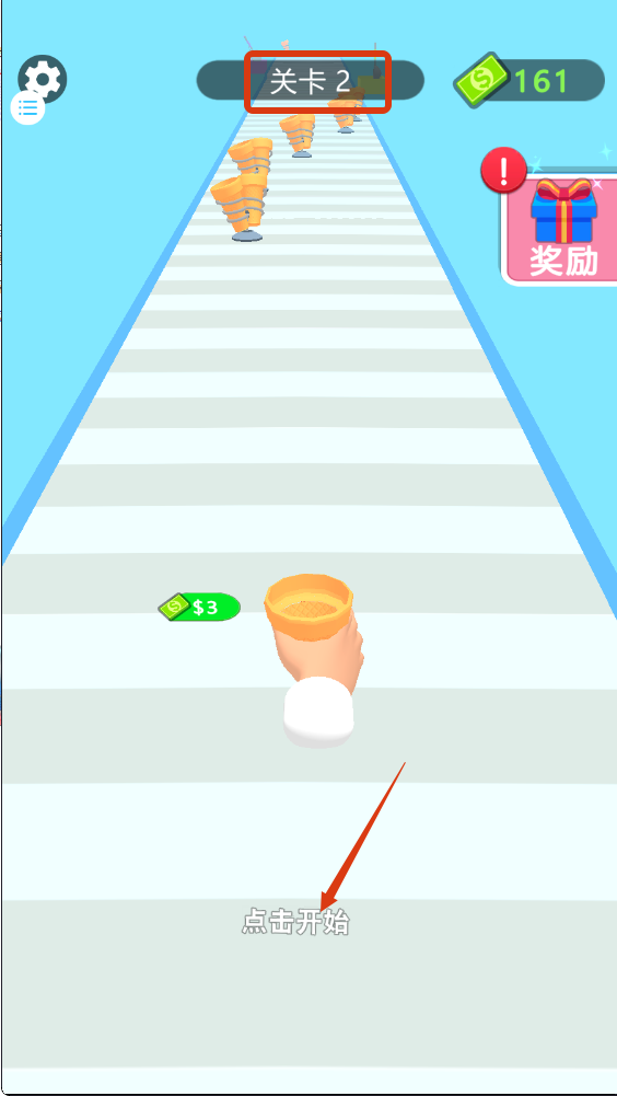 1、点击【开始】进入关卡1,优先收集赛道元素,留意右侧【奖励】入口,为游戏积累资源。