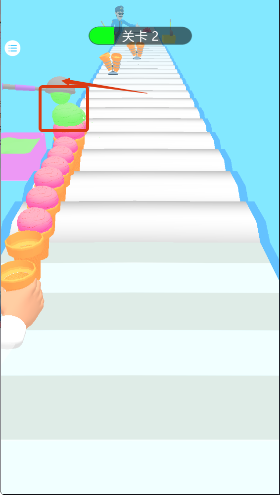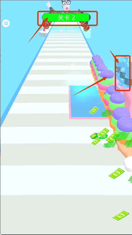 4、通过手指滑动控制冰淇淋的移动轨迹,准确经过配料喷洒装置,接住落下的装饰配料完成制作任务。