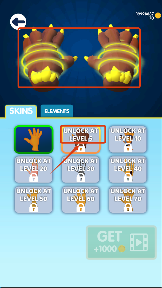 1、在皮肤界面,不同皮肤需达到对应等级解锁,如【UNLOCK-AT-LEVEL-5】,积累金币(当前【19998887-70】)可助力解锁和升级。