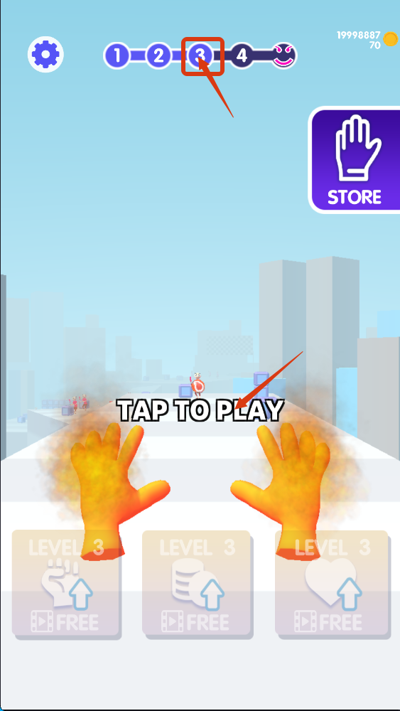 2、点击【TAP-TO-PLAY】进入关卡3,利用积累的资源升级战力,开启关卡挑战。