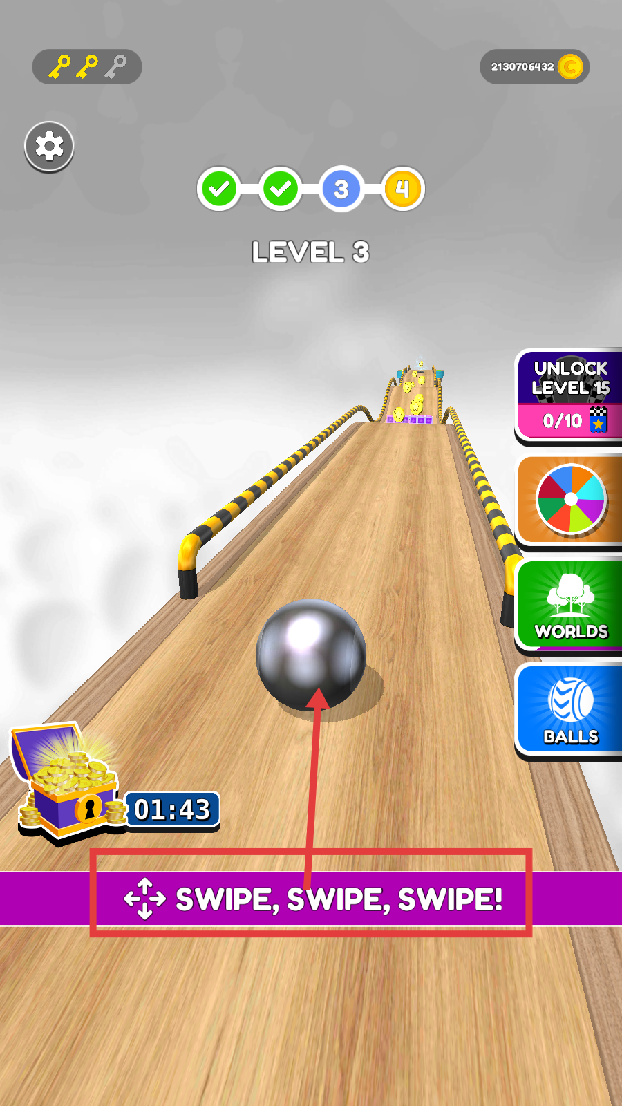 1、进入【LEVEL3】,轻滑屏幕控制金属球,掌握【SWIPE】操作,开启滚球冒险挑战。