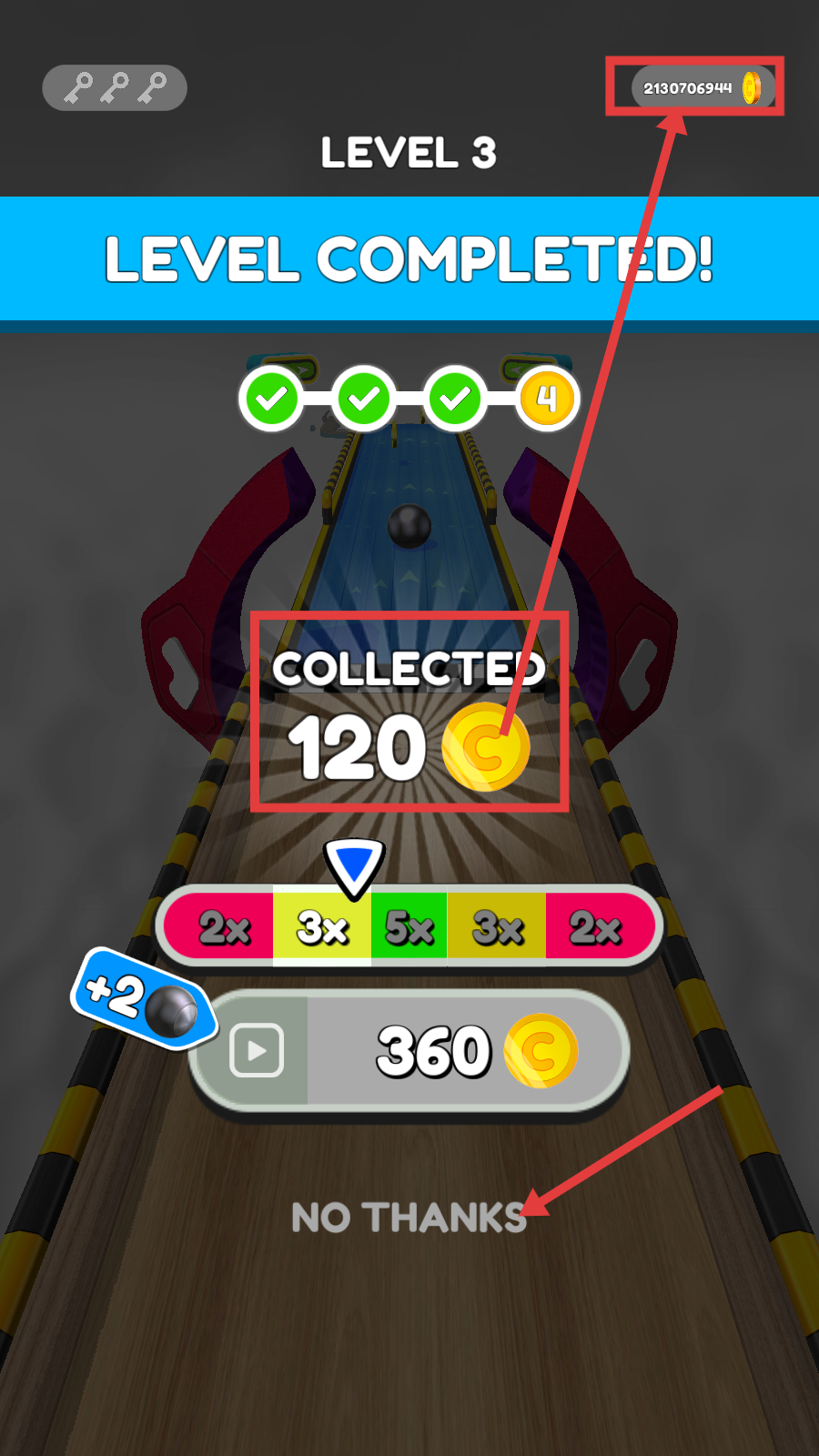 4、成功通关【LEVEL3】获得120金币,点击【NO-THANKS】继续,积累资源提升游戏进度。