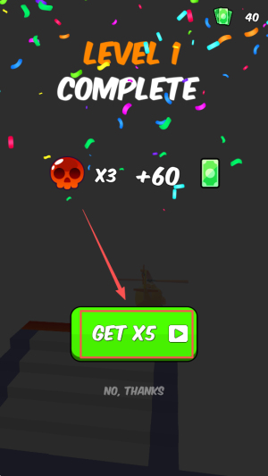 4、最后,完成关卡后点击“GET X5”按钮获取奖励,或选择“NO, THANKS”跳过。