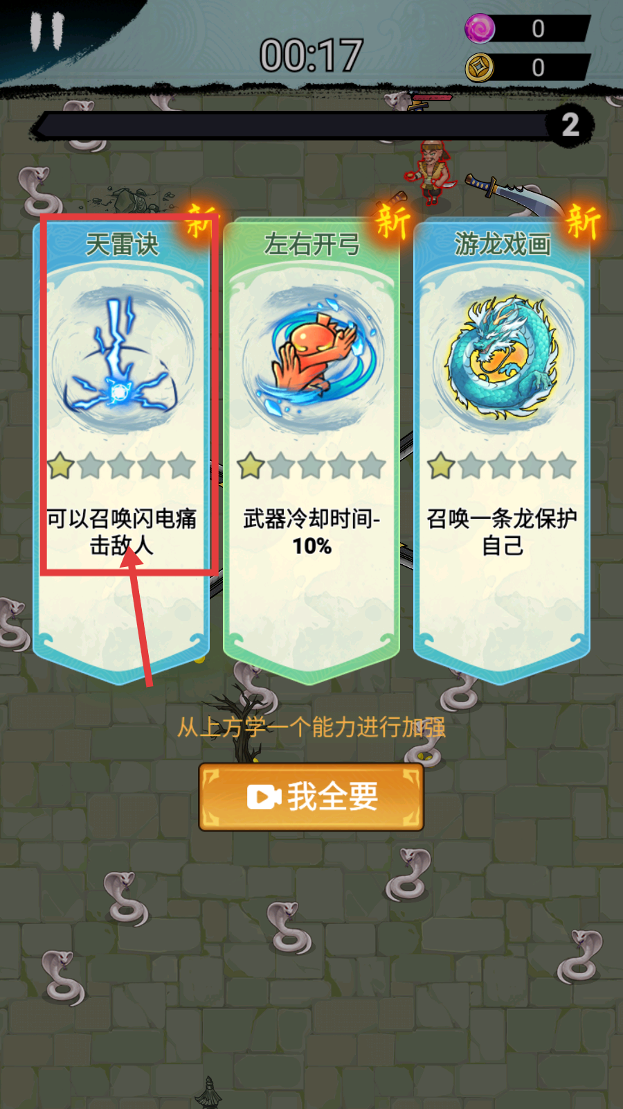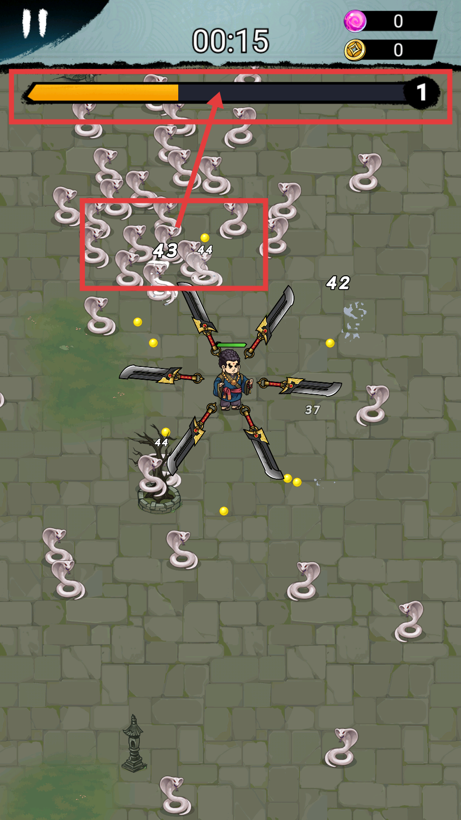 2、战斗中持续清理【蛇怪】,积累经验推进上方进度条,提升等级以解锁更多能力。