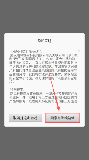 1、首先,阅读并同意隐私政策,点击“同意并继续游戏”按钮。