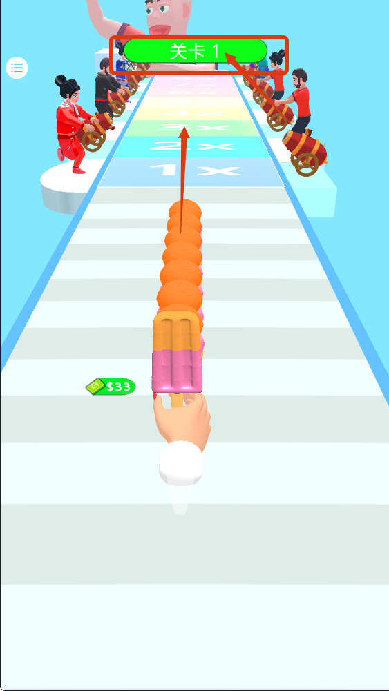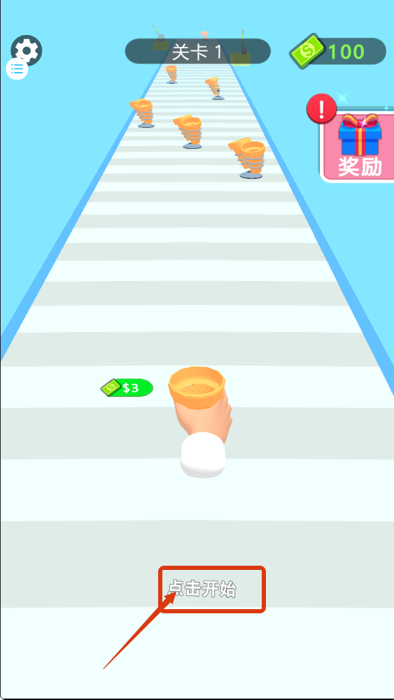 1、点击【开始】进入关卡1,优先收集赛道元素,留意右侧【奖励】入口,为游戏积累资源。
