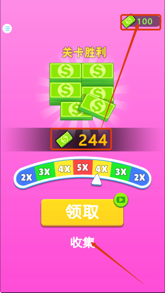 4、关卡胜利后点击【领取】获【244-金币】,积累的【100-金币】可用于解锁功能或道具,提升体验。