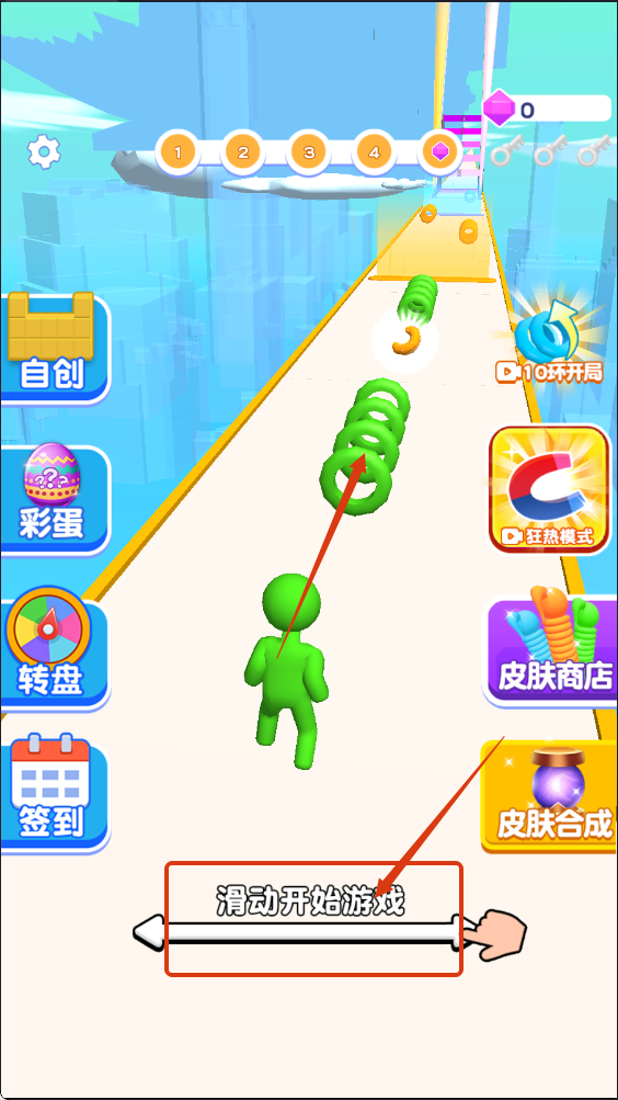 1、滑动开始游戏后,优先收集【绿色-圆环】,它们是提升角色高度的关键,同时熟悉左侧【自创】【彩蛋】等功能入口。