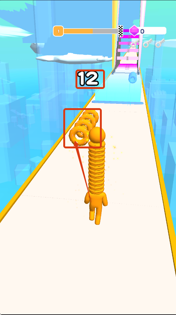 2、在赛道上持续收集【橙色-圆环】,积累数量可提升角色高度,上方数字显示当前收集量,助力通过后续障碍。