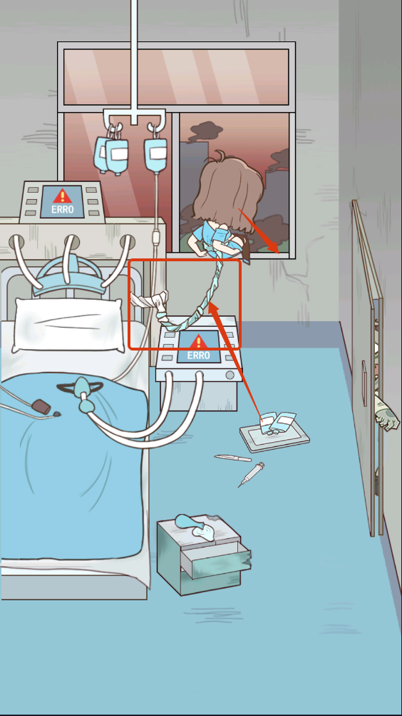 3、利用场景中的【绳子】道具,协助小姐姐从窗口逃离,完成病房逃脱的关键步骤。