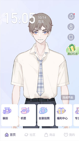 之后将正式进入次元世界,软件界面类似于手机主界面的操控,其中左上角显示的是当前时间,下方的功能则是:装扮、祈愿和创意拍照等等。