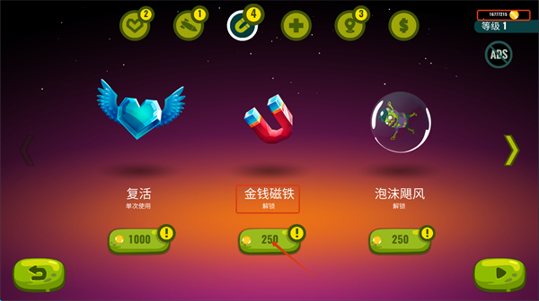 1、解锁【金钱磁铁-250】,提升金币收集效率,助力资源积累,优先解锁可加快游戏进程。