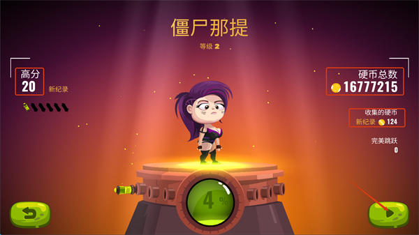 4、结算界面查看【硬币总数-16777215】和新纪录,点击继续按钮,开启下一轮冒险。