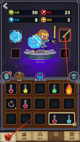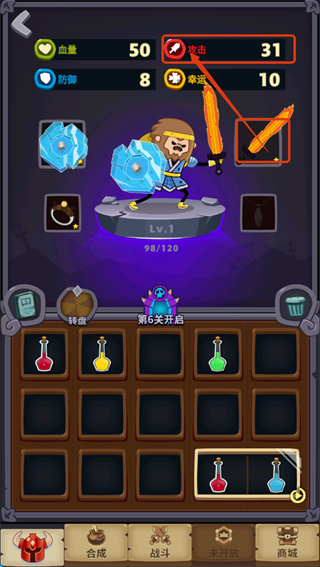 3、合成后获得火焰剑,【攻击-31】【幸运-10】属性提升,增强角色战斗能力,为后续关卡做准备。
