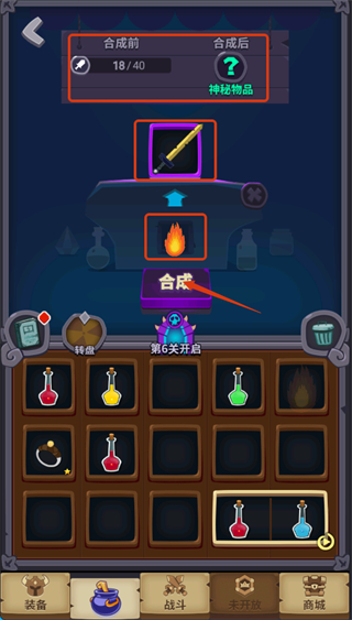 2、进入合成界面,将剑与火焰元素合成,合成前【18/40】,点击合成按钮,解锁神秘物品。