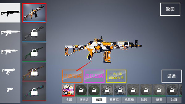 2、可以通过武器抽奖、皮肤抽奖或者是广告获取金币的方式来解锁武器;