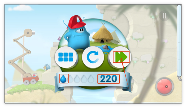 4、灭火成功后,查看水滴评价(如1滴水滴)和分数(如220分),点击绿色箭头按钮,继续挑战后续关卡。
