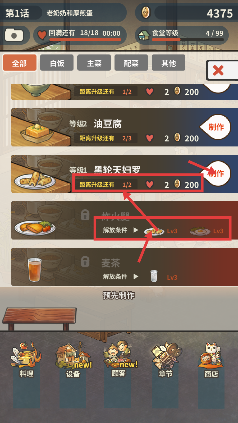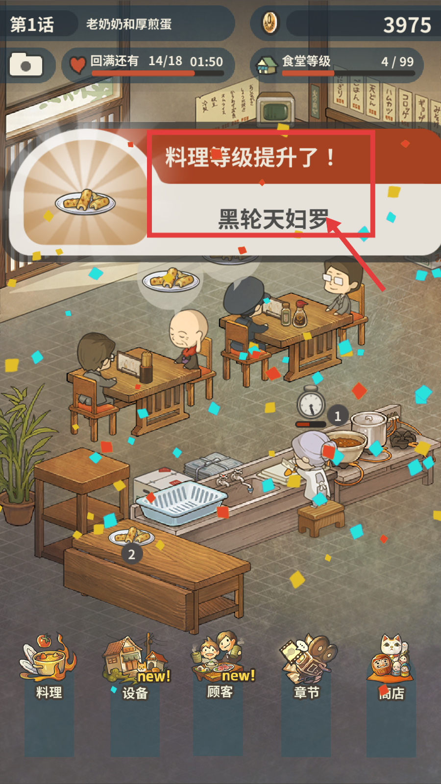 2、完成【黑轮天妇罗】制作后,其等级提升,提升料理品质以满足顾客更高需求。