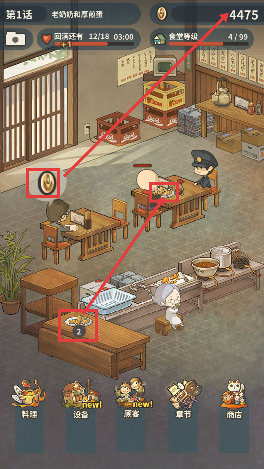 3、及时将制作好的料理送达顾客,获取金币资源,积累【4475】金币助力食堂发展。