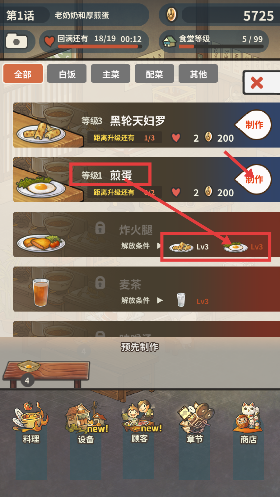 4、制作【等级1-煎蛋】,需满足对应解锁条件,花费2爱心200金币,丰富料理种类。