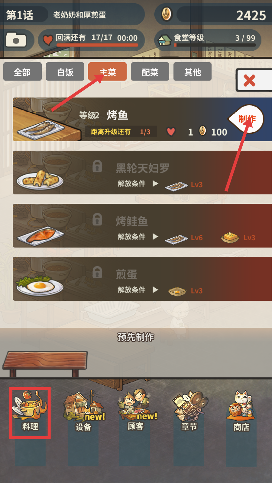 1、点击【料理】进入主菜分类,制作【等级2-烤鱼】,花费1爱心和100金币开启制作流程。
