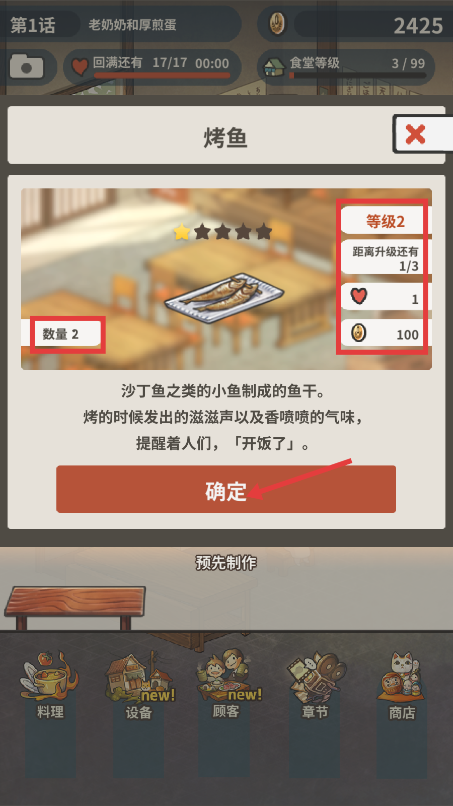 2、确认制作【烤鱼】,消耗资源后获得数量2的餐点,为顾客用餐储备主菜。