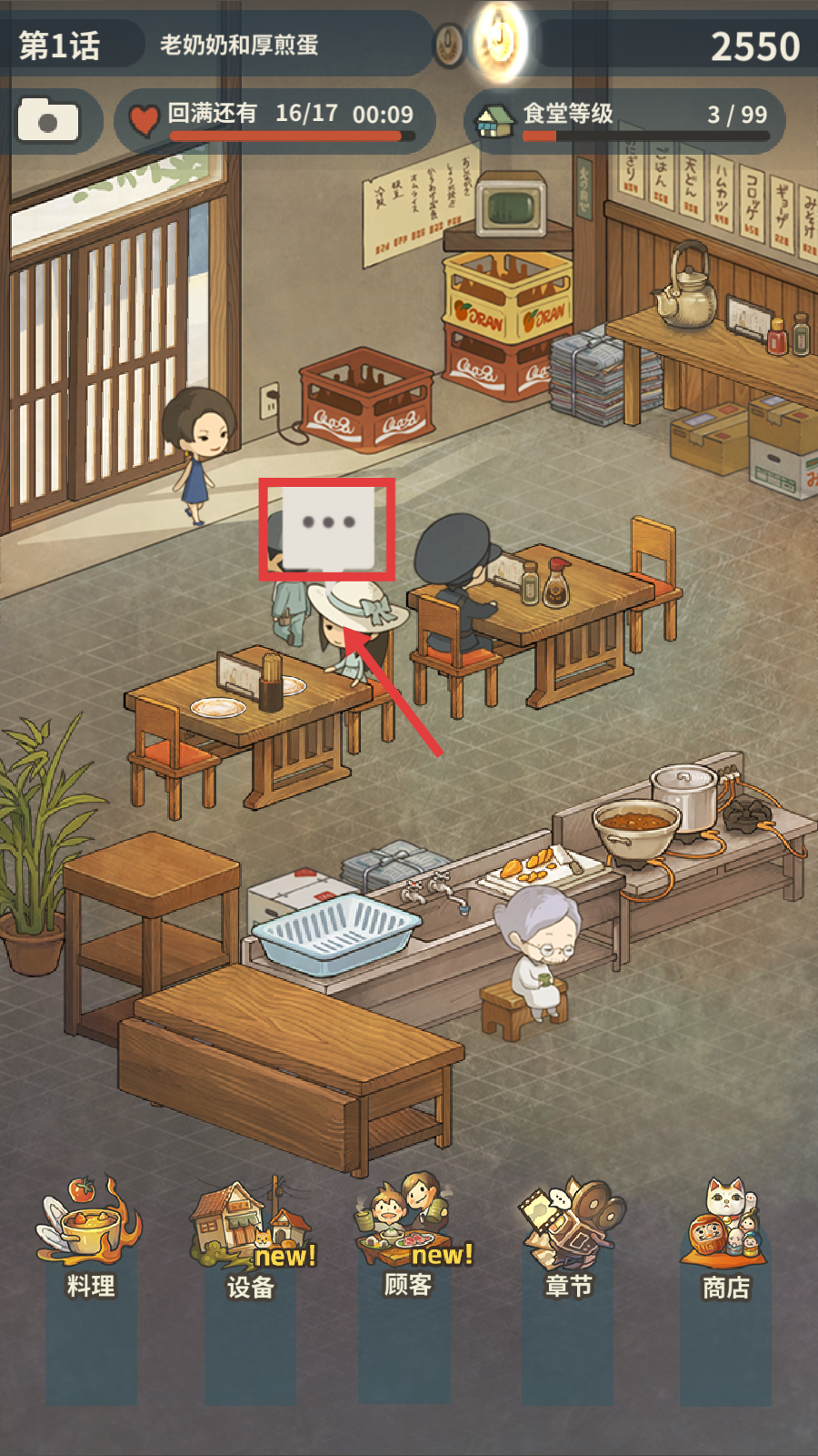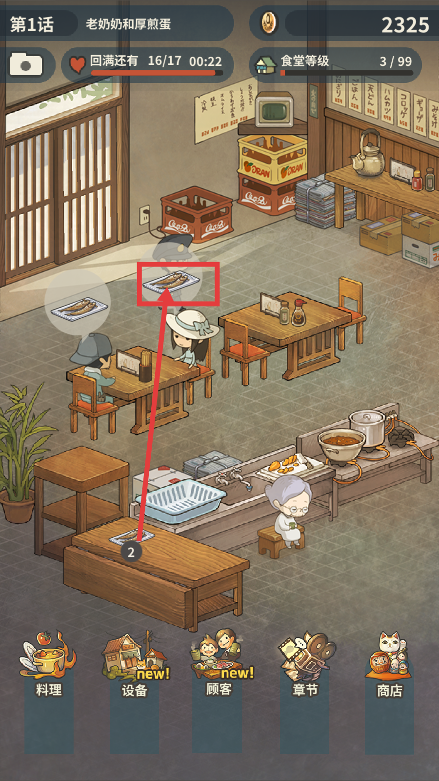 4、关注顾客用餐进度,积累资源提升【食堂等级-3/99】,逐步解锁更多料理和功能。