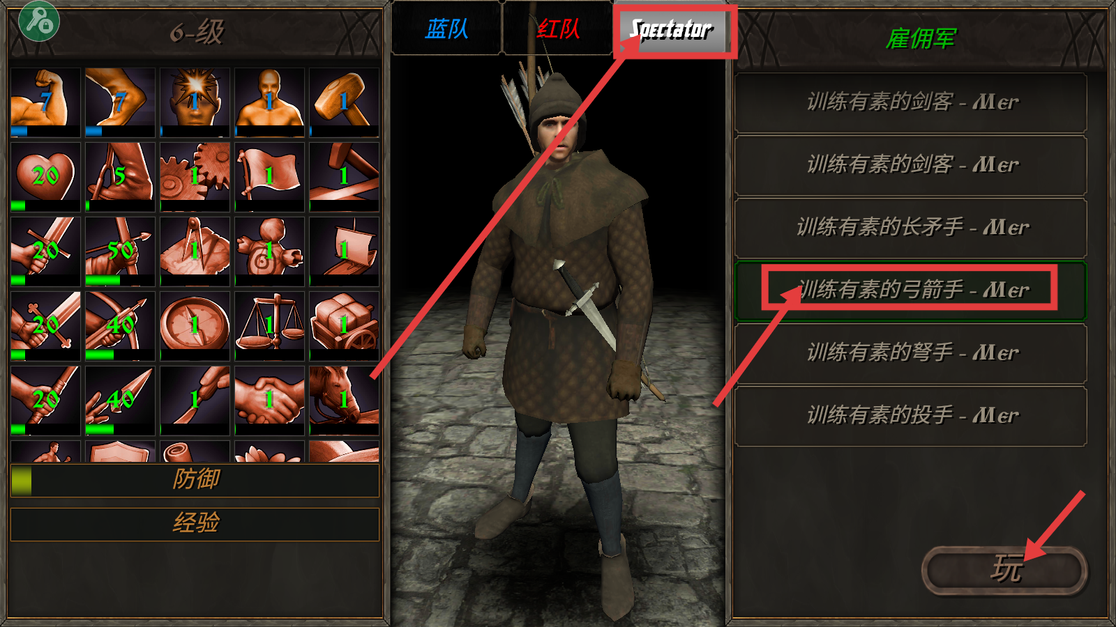 1、选择【Spectator】阵营,在雇佣兵列表中选择【训练有素的弓箭手-Mer】,点击【玩】进入游戏。