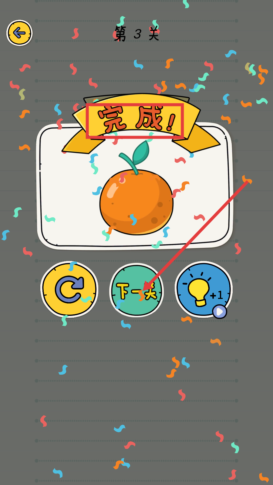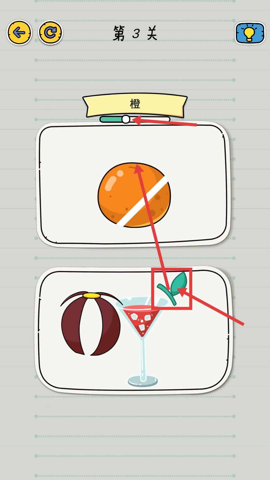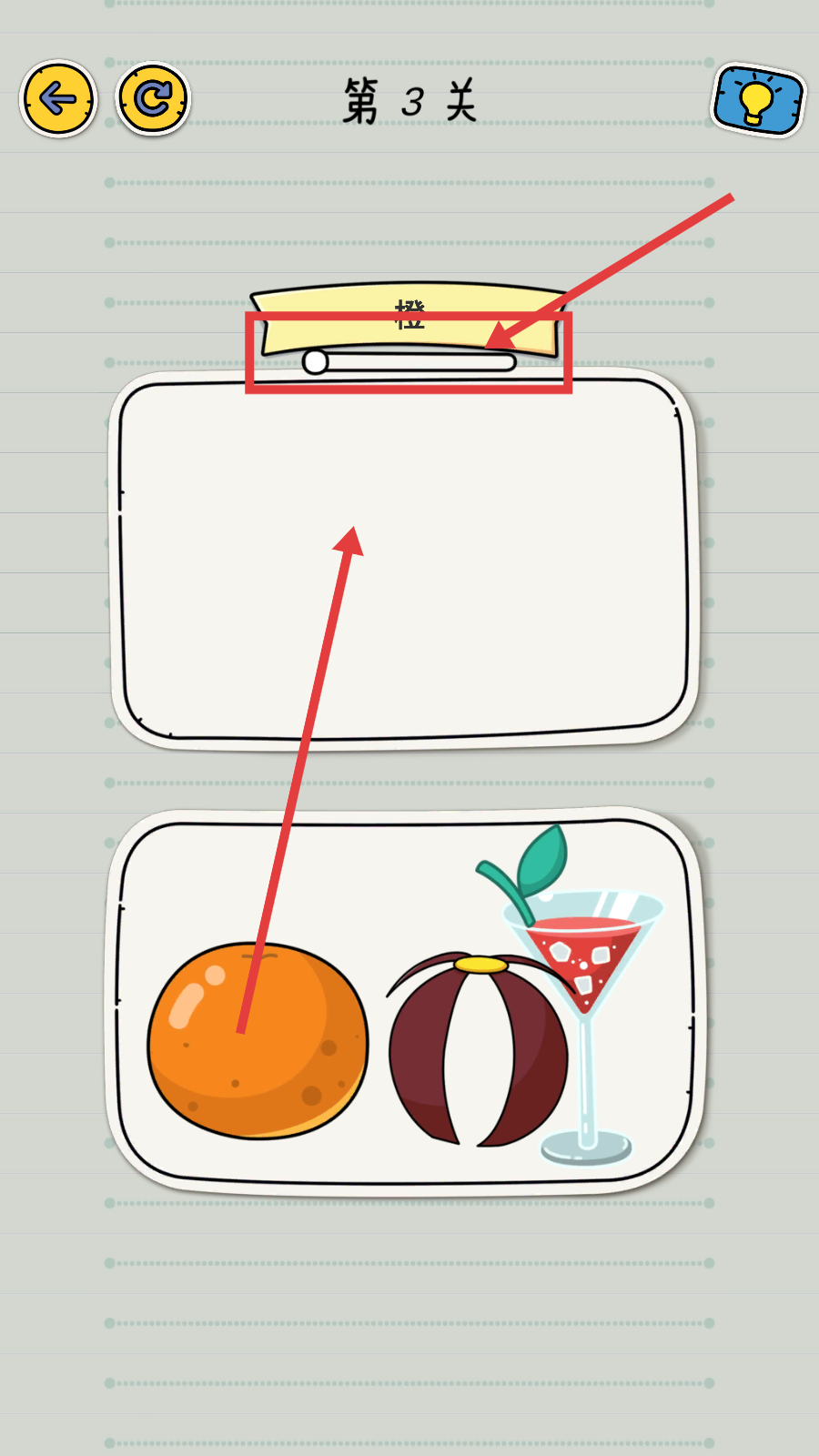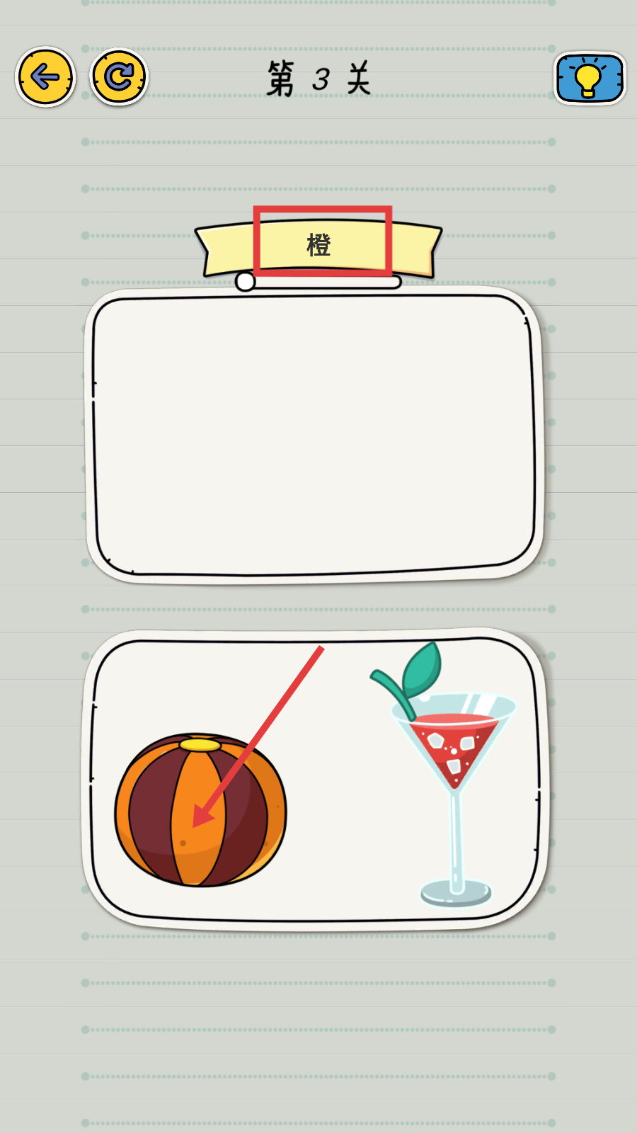 1、第3关根据【橙】的提示,选择下方带有橙色的元素,开启橙子拼接的第一步。