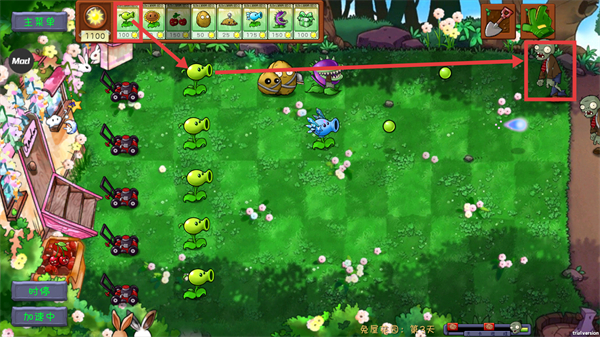 2、种植【豌豆射手】,利用其发射豌豆攻击僵尸,为抵御僵尸进攻建立初步防线。