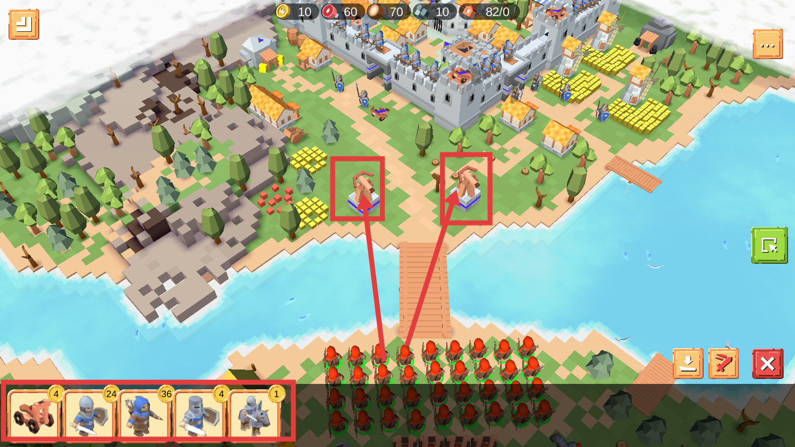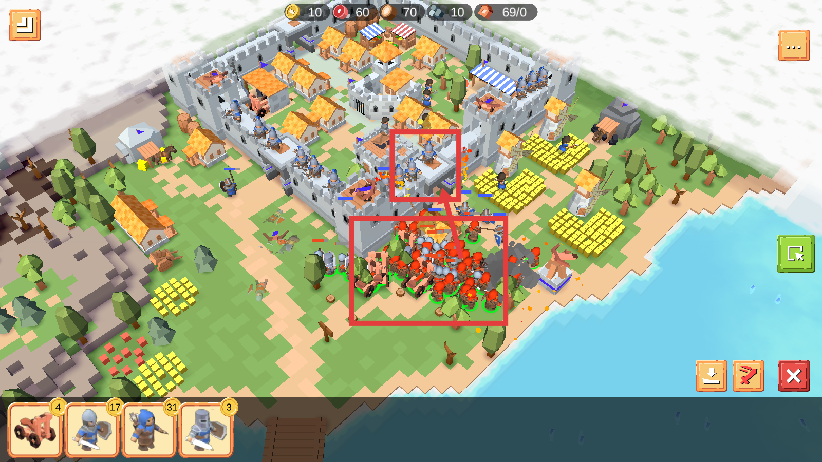 3、指挥士兵集群进攻敌方城堡,突破防御工事,夺取关键建筑,扩大攻城优势。