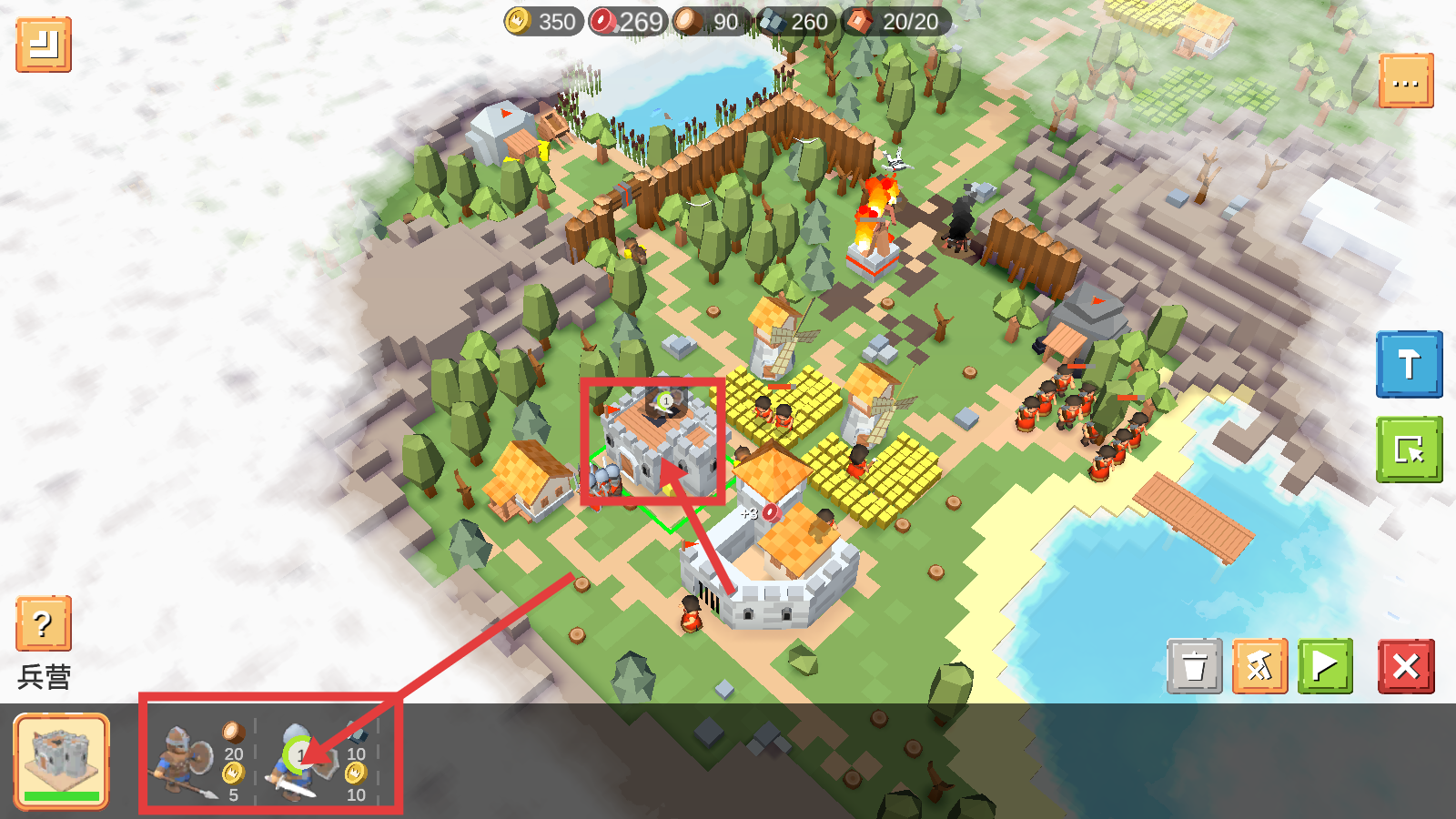 2、建造【兵营】,消耗资源招募士兵(如持盾士兵),提升村庄防御战力,为抵御敌人做准备。