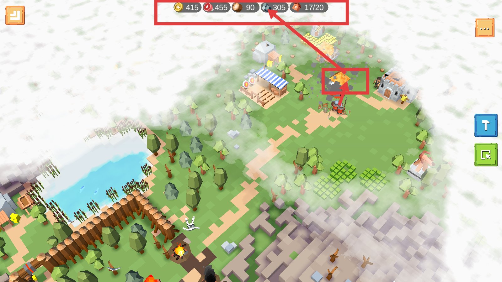 4、积累【金币-415、石材-305】等资源,及时修复燃烧的建筑,维持村庄正常运作与发展。