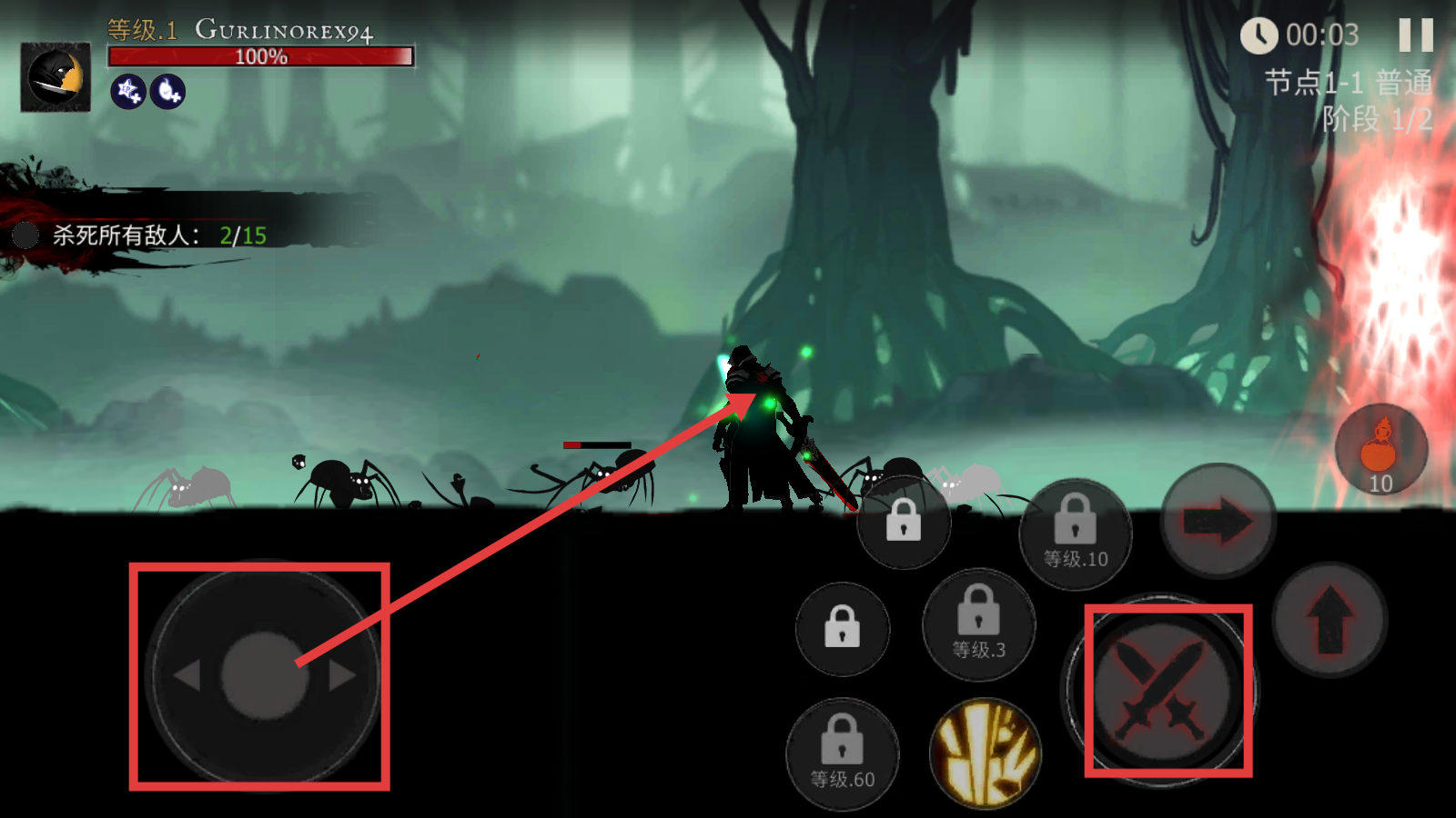 2、战斗中用左侧摇杆移动角色,右侧攻击按钮消灭敌人,按进度完成【杀死所有敌人-2/15】的目标。