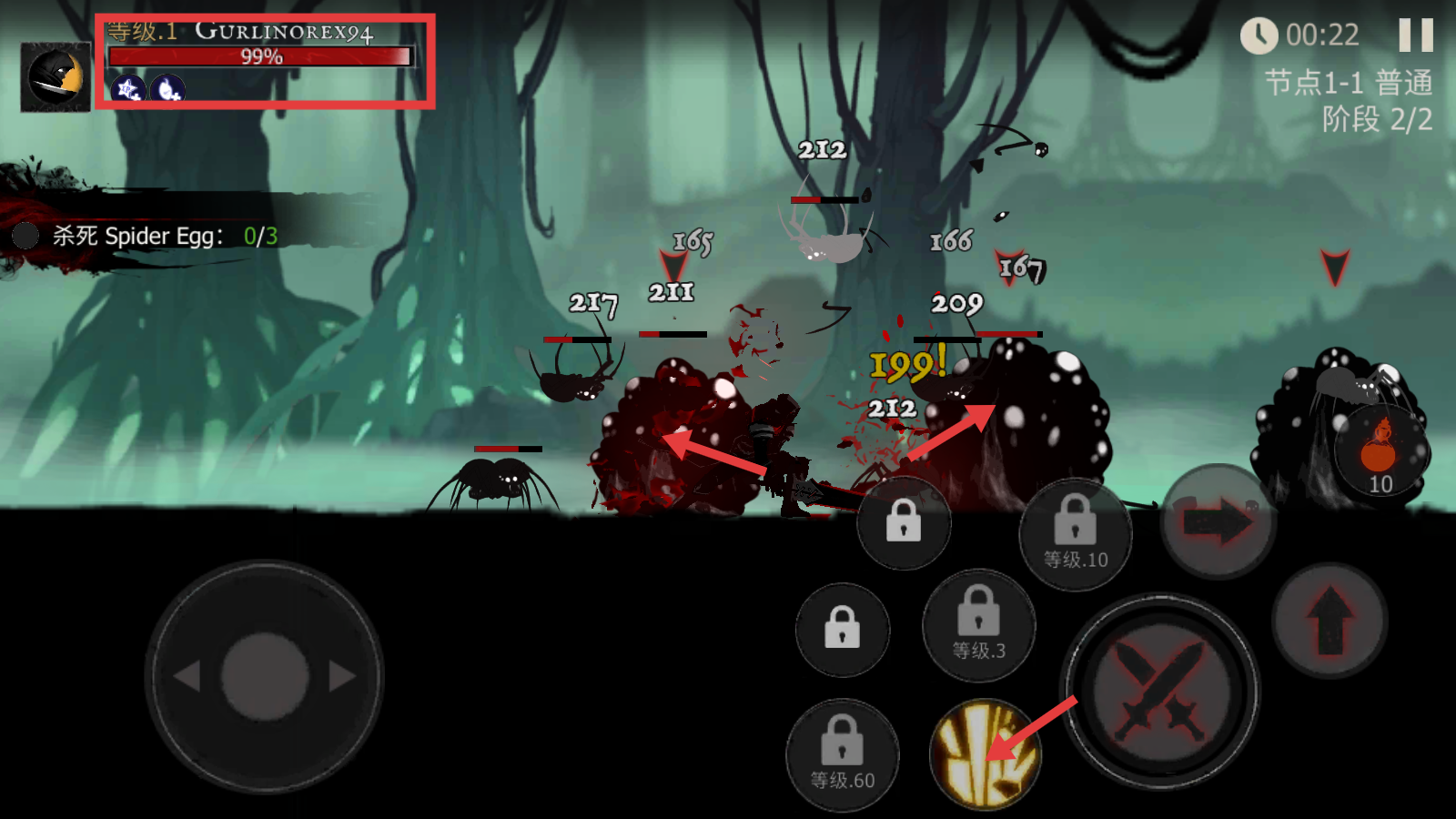 3、关注【等级.1-GURLINOREX94】的生命值,使用技能攻击【Spider-Egg】,推进阶段2/2的战斗。