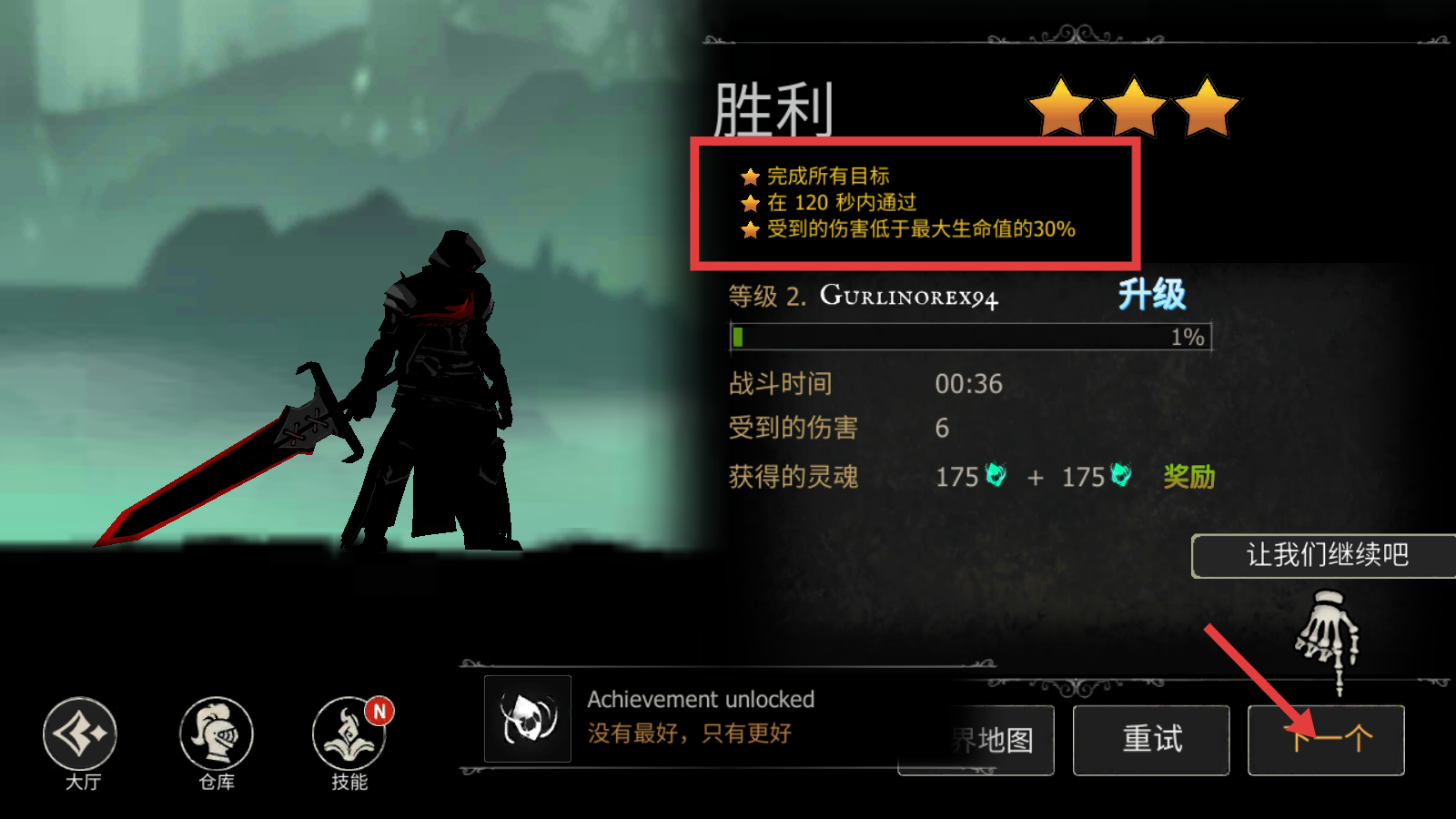 4、胜利后达成所有目标,点击【下一个】继续关卡,升级角色并获取灵魂奖励。