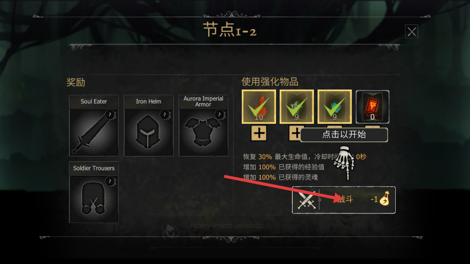 1、在【节点I-2】界面,使用强化物品后点击【战斗】,可获取【Soul-Eater】等奖励,开启关卡挑战。