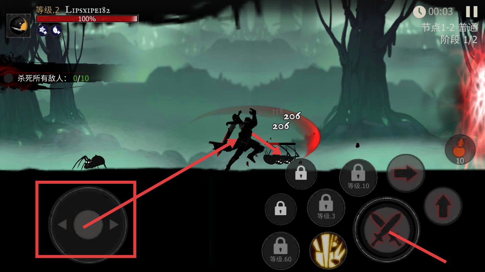 2、战斗中用左侧摇杆移动角色,右侧攻击按钮消灭敌人,完成【杀死所有敌人-0/10】的阶段1目标。