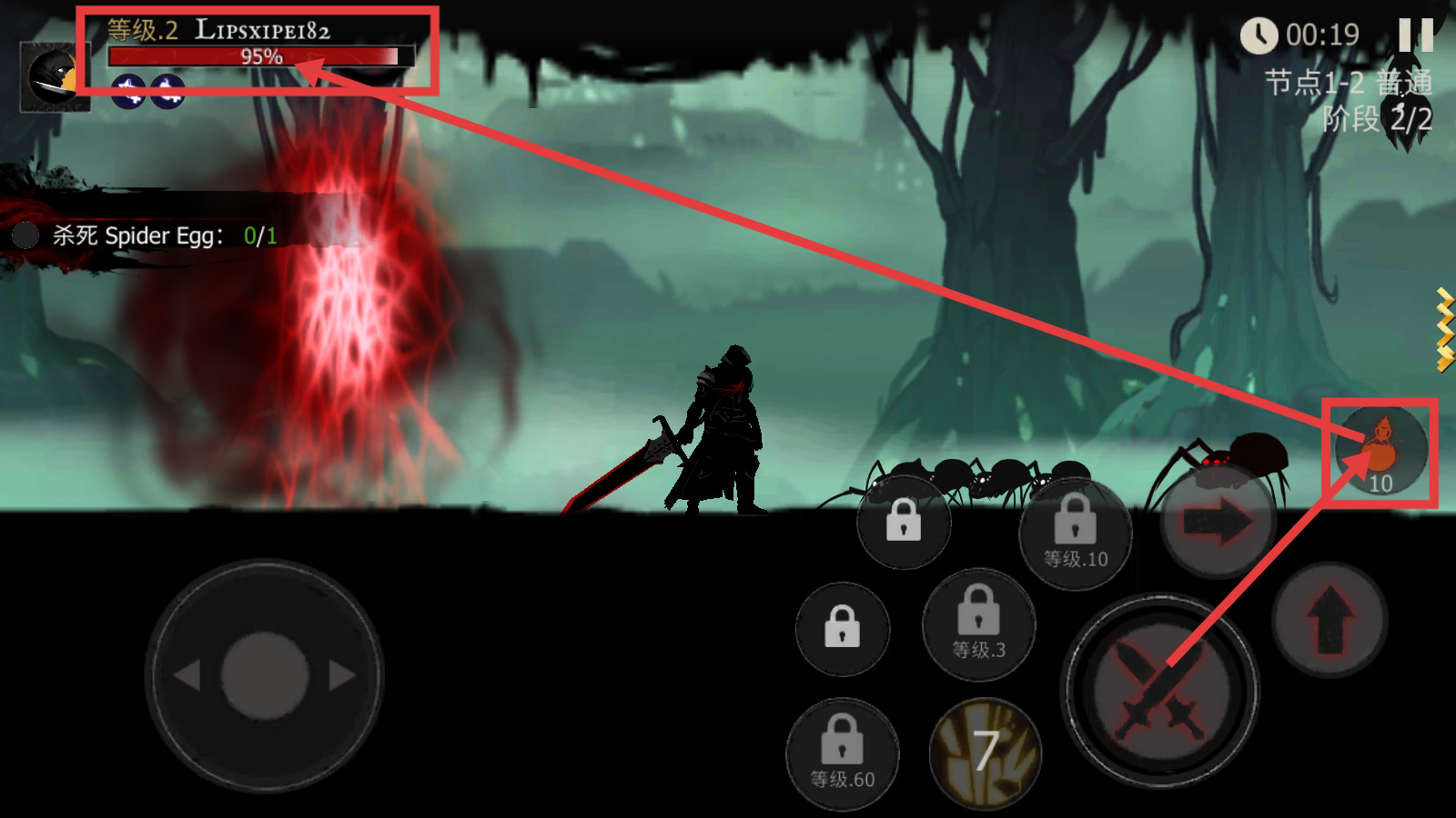 3、关注【等级.2-LIPSXIPE182】的生命值,使用强化物品,完成【杀死Spider-Egg-0/1】的阶段2目标。