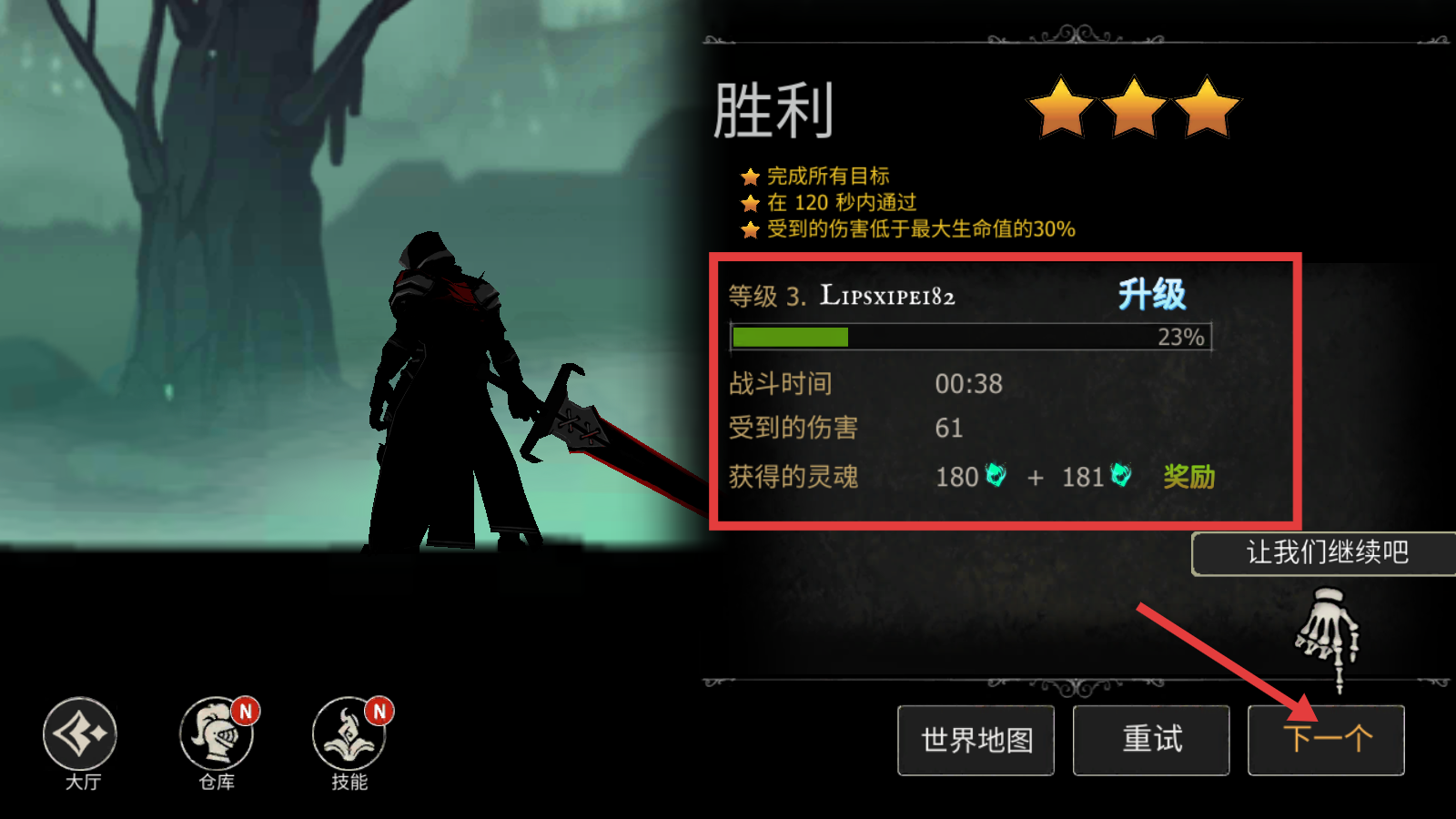 4、胜利后角色升级到【等级.3-LIPSXIPE182】,点击【下一个】继续关卡,获取灵魂奖励。