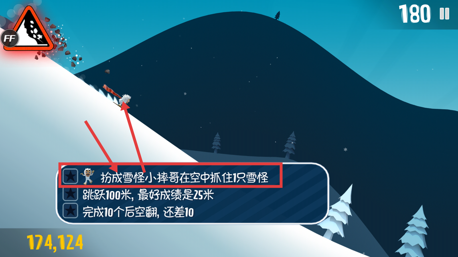 2、扮演“雪怪小摔哥”在空中抓住1只雪怪,同时推进“跳跃100米”“完成10个后空翻”等任务目标。