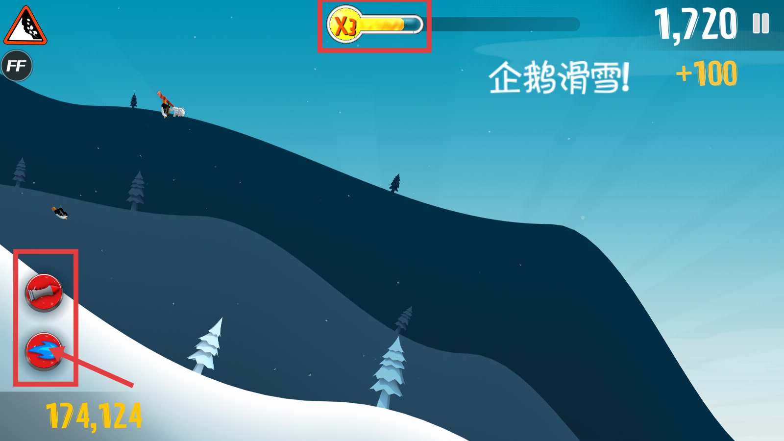 3、滑雪时合理使用左侧道具,关注上方分数倍率(如×3),提升分数获取效率。