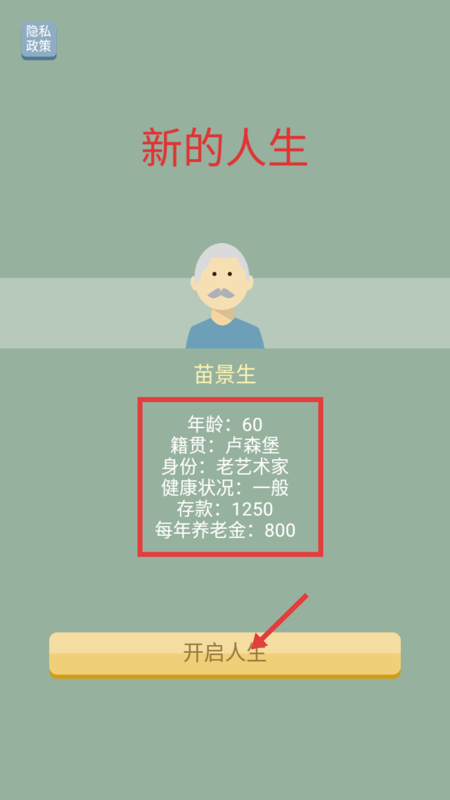 1、开启新人生时,关注角色苗景生【年龄-60】【存款-1250】等属性,点击【开启人生】,开启老年模拟之旅。