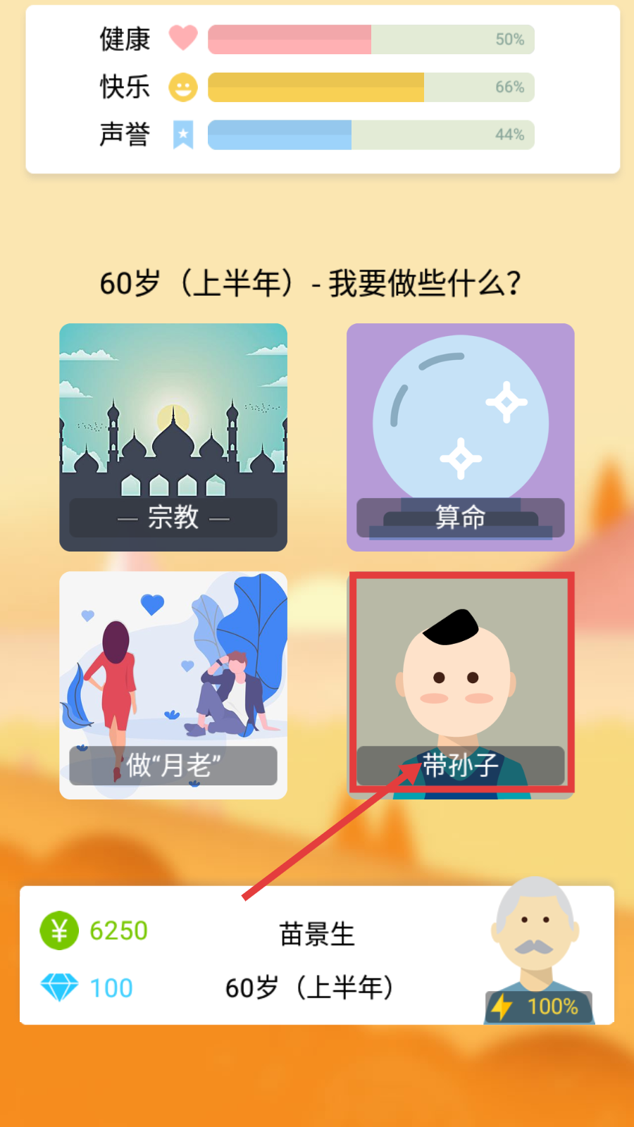 2、在60岁上半年,选择【带孙子】活动,推进人生进程,同时留意健康、快乐、声誉等属性变化。